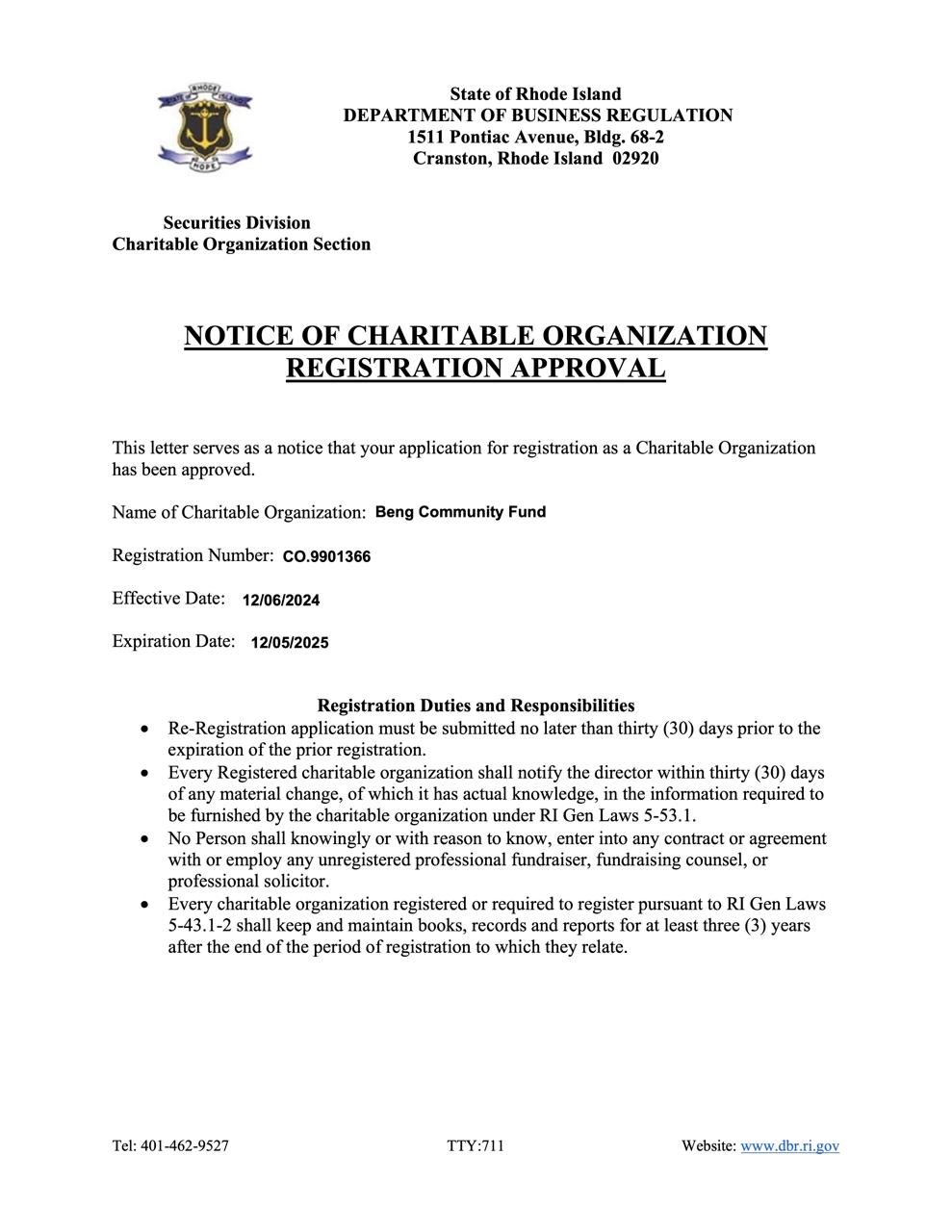 • Letter from the State of Rhode Island Dept. of Business Regulation attesting to approval of the BCF as a charitable organization registered in the state